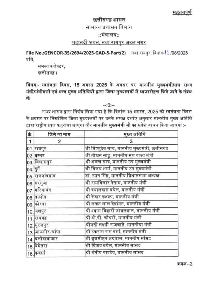 रायपुर। स्वतंत्रता दिवस के अवसर पर छत्तीसगढ़ के मुख्यमंत्री विष्णु देव साय रायपुर में झंडा फहराएंगे, जबकि केंद्रीय राज्यमंत्री तोखन साहू बस्तर में यह सम्मान निभाएंगे। वहीं, राज्य के स्पीकर डॉ. रमन सिंह राजनांदगांव में झंडा वंदन कार्यक्रम का संचालन करेंगे।