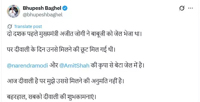 उन्होंने पोस्ट में लिखा, “दो दशक पहले जब मुख्यमंत्री अजीत जोगी ने मेरे बाबूजी को जेल भेजा था, तब दीवाली के दिन उनसे मिलने की अनुमति मिल गई थी। लेकिन आज, प्रधानमंत्री मोदी और अमित शाह की कृपा से बेटा जेल में है और मुझे उससे मिलने की अनुमति तक नहीं मिली। बहरहाल, सभी को दीपावली की हार्दिक शुभकामनाएं।”