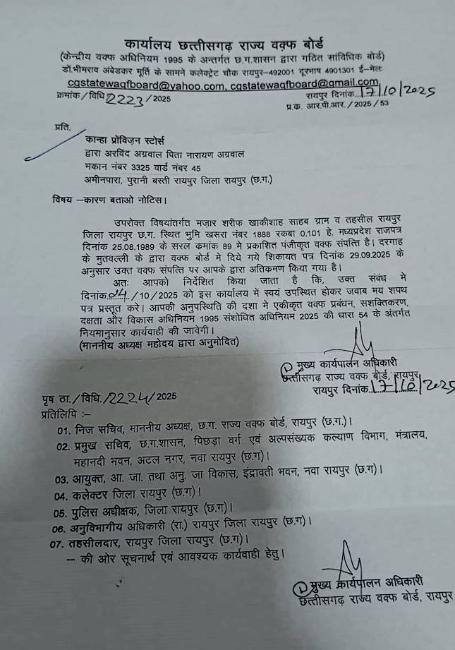रायपुर।रायपुर के पुरानी बस्ती में रहने वाले कई हिंदू परिवारों को वक्फ बोर्ड ने नोटिस थमा दिया है, जिसमें दावा किया गया है कि उनके मकान वक्फ बोर्ड की जमीन पर बने हुए हैं। नोटिस में परिवारों को दो दिन के भीतर कलेक्टर के सामने पेश होकर जवाब देने के लिए कहा गया है, अन्यथा उनके खिलाफ कानूनी कार्रवाई की जाएगी।