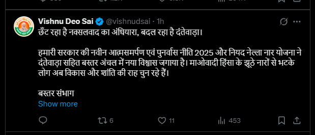71 नक्सली अब विकास और शांति की राह पर: हथियार छोड़ किया आत्मसमर्पण बस्तर में बदल रहा है माहौल: छँट रहा है नक्सलवाद का अंधियारा – मुख्यमंत्री रायपुर, मुख्यमंत्री श्री विष्णु देव साय ने कहा कि राज्य सरकार की नवीन आत्मसमर्पण एवं पुनर्वास नीति 2025 और नियद नेल्ला नार योजना ने दंतेवाड़ा सहित पूरे बस्तर अंचल में नया विश्वास जगाया है। माओवादी हिंसा के झूठे नारों से भटके लोग अब विकास और शांति की राह चुन रहे हैं। मुख्यमंत्री श्री साय ने कहा कि बस्तर संभाग में चलाए जा रहे…