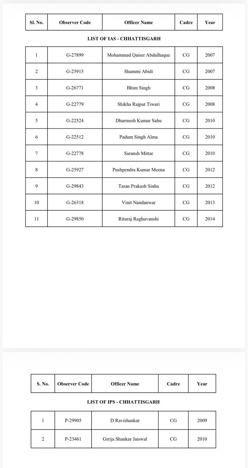 рдЫрддреНрддреАрд╕рдЧрдврд╝ рдХреЗ 11 IAS рдФрд░ 2 IPS рдЕрдзрд┐рдХрд╛рд░реА рдирд┐рдпреБрдХреНрдд, рдмрд┐рд╣рд╛рд░ рд╡рд┐рдзрд╛рдирд╕рднрд╛ рдЪреБрдирд╛рд╡ рдореЗрдВ рдирд┐рднрд╛рдПрдВрдЧреЗ рдЕрд╣рдо рдЬрд┐рдореНрдореЗрджрд╛рд░реА